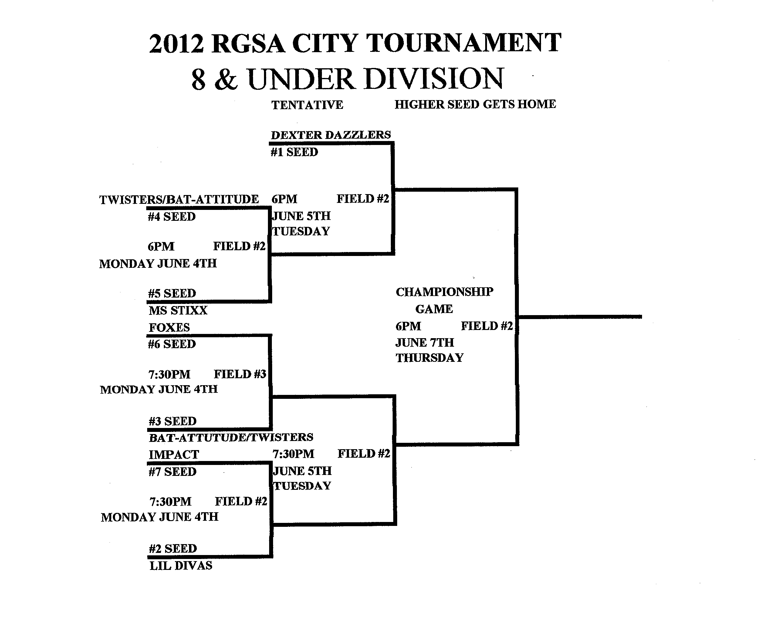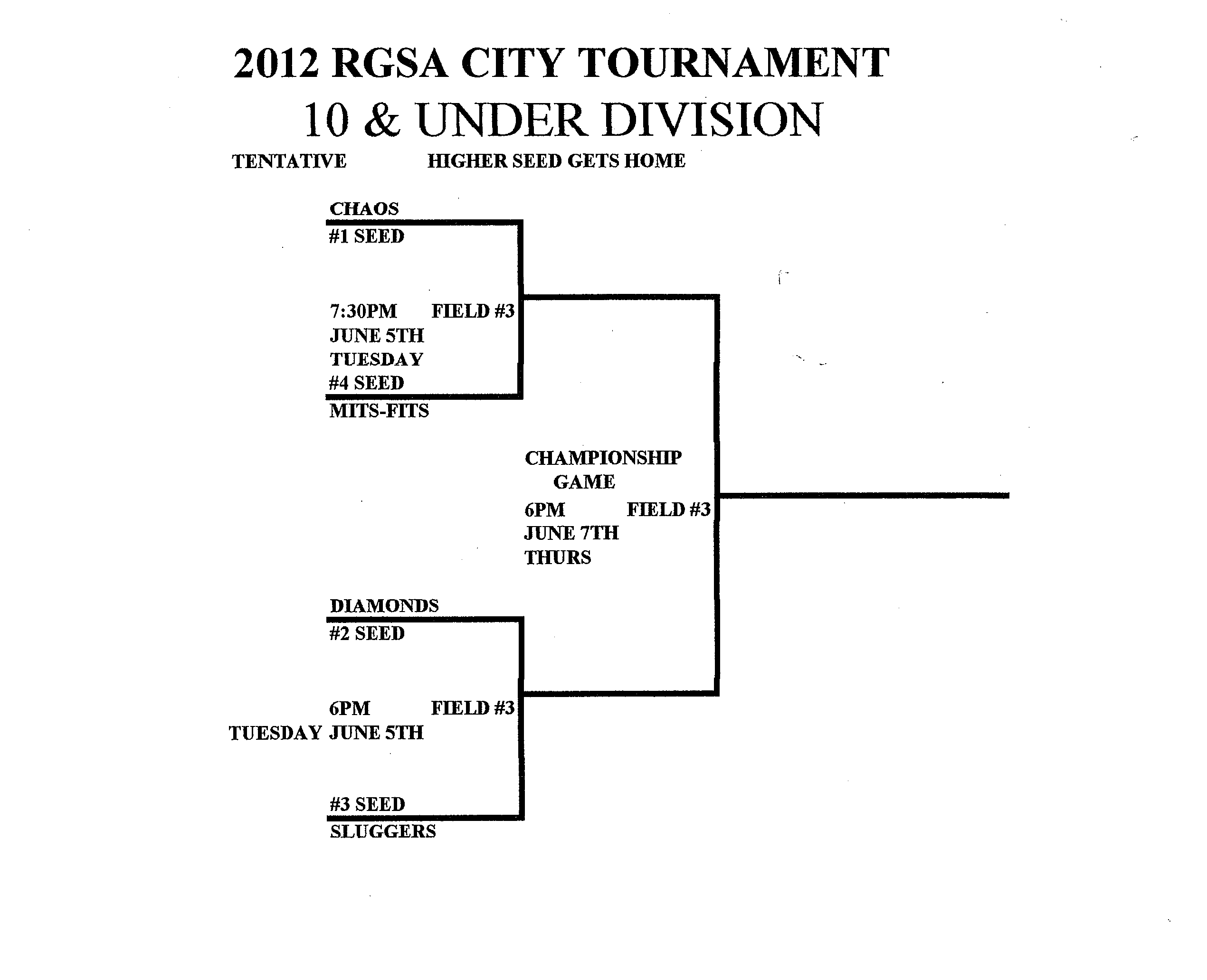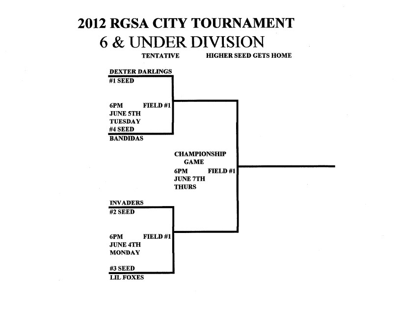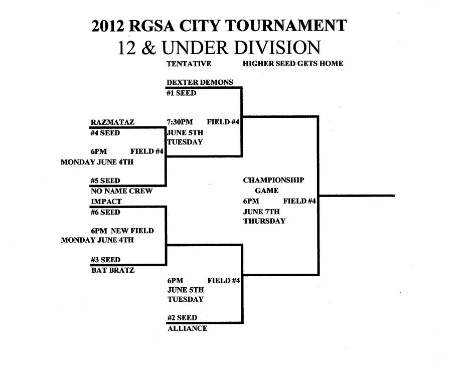The 2012 RGSA City Tournament will take place next week the 4th, 5th and 7th of June. Here’s the info and brackets I received from the board. For pdf copies of the following brackets you can download them by selecting the following links – 6U, 8U, 10U or 12U.