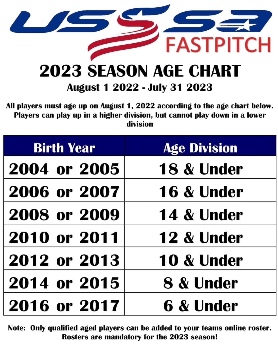 Please be aware, age restrictions, by birth year, will be followed as per the USSSA age division chart. You will need to show your player’s birth certificate at time of registration.